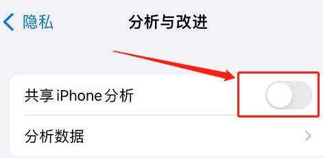 在隐私页面中往下拉,点击【分析与改进】,然后在页面中,把【共享iPhone分析】的开关按钮关闭,如图所示。