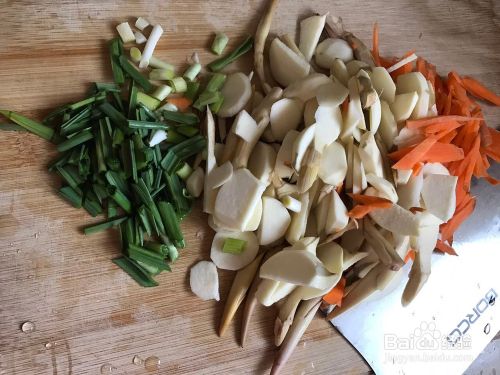 锅中放油,放入茨菰、胡萝卜、咸菜煸炒,放少许糖,放入青蒜,煸炒。炒得过程,茨菰会容易干,可以放点水煸炒。一次加少许,加两次就可以了。