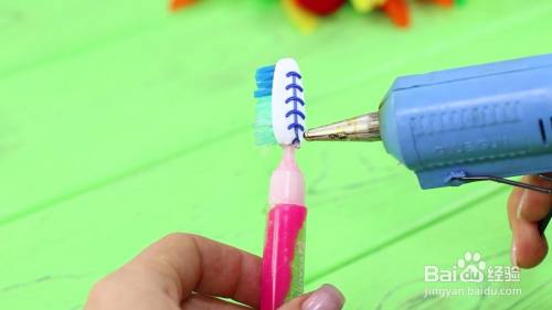 然后用热胶将牙刷和亮粉液体管沾在一起。
