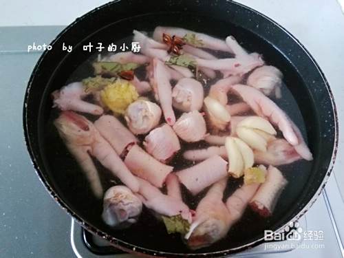 锅中放适量凉水,放入八角、香叶、拍碎的生姜、大蒜瓣,倒入适量料酒,放入鸡爪,烧开后煮10分钟