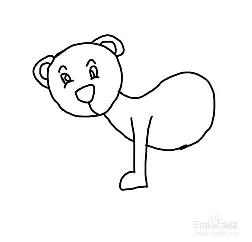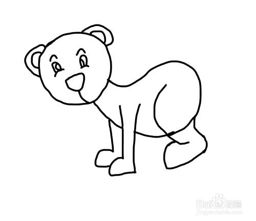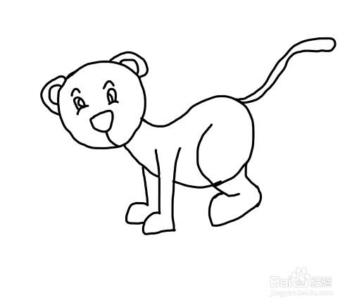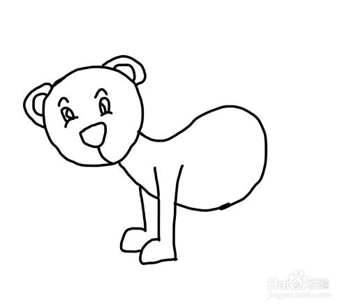 第四步,画完头部后,接着画出小豹子下半身的形状外轮廓,注意曲线变化。原后画出它的前2只腿的形状。