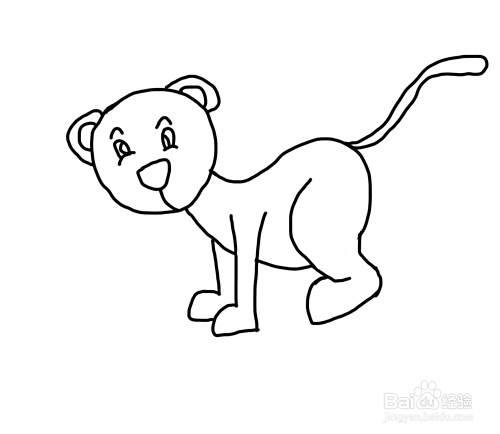 第五步,画完前腿,接着画出小豹子的后腿形状,擦掉轮廓上多余的线条,最后画出小豹子的尾巴形状。