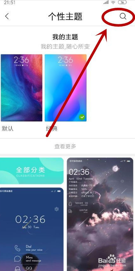 在“个性主题”页面单击右上角的“搜索”图标