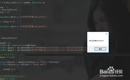 保存编写好的代码,按键盘上的F5运行代码,可以看到提示,与小编安装的office版本一直,那么使用C#获取office版本就成功了。
