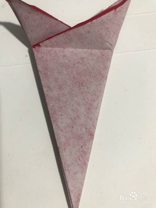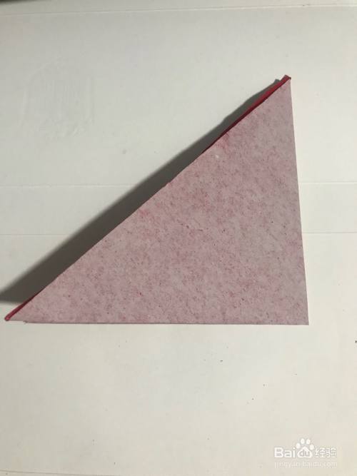 第一步 取一张16厘米长X16厘米宽的正方形红色彩纸 先把它从下向上对角折叠整齐 然后再从右向左对角折叠