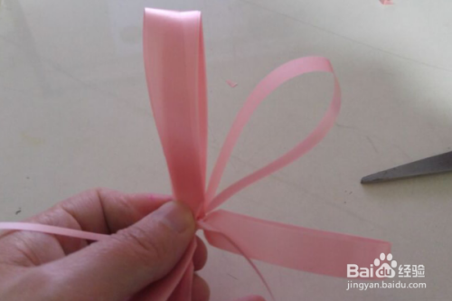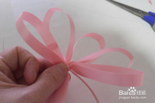 接下来,我们将丝带盘成一个圈,一圈盘好后,再盘4圈,这样就盘成了5圈,然后用剪刀剪断,在接头的地方用透明胶固定两个断头就可以了。