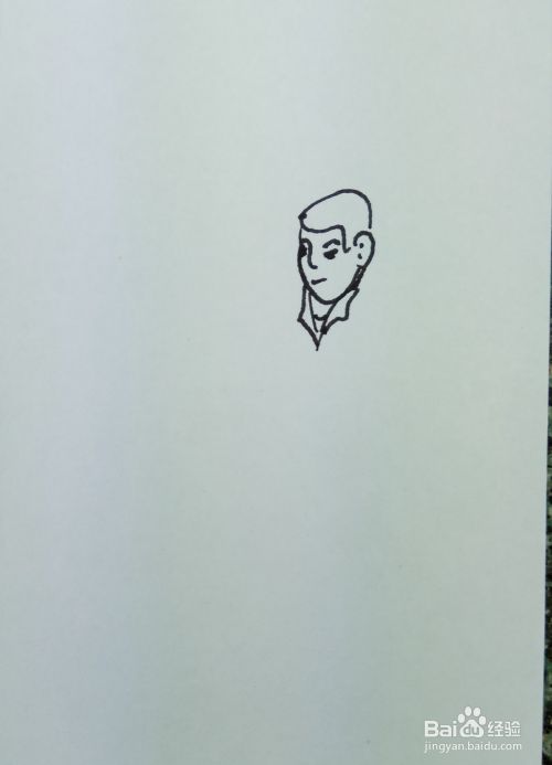 先画头部,在白纸上用线条和曲线画出一个人的头部轮廓,然后再画出这个人的五官和头发,并画出他的衣服领子部分。