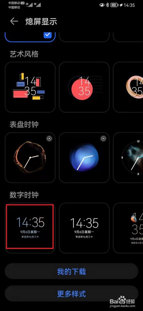 在熄屏显示页面,开启熄屏显示开关后,选择显示时间样式即可。