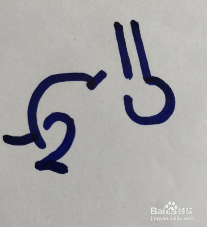 在撇曲线的右上,画上两条平行的捺曲线,作为兔子耳朵。
