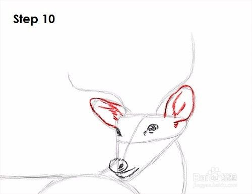 第10步:使用初始形状作为指导绘制鹿的耳朵。在耳内和耳周使用快速,短暂的敲击来给它更多的结构。