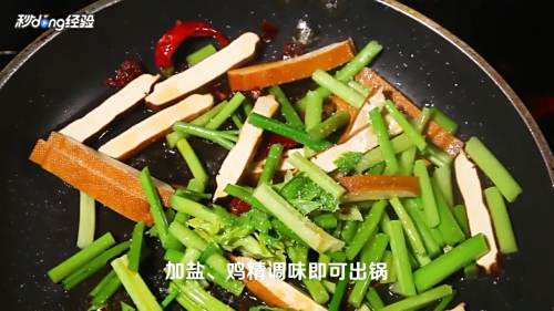 放入香干、香芹翻炒,加盐、鸡精调味即可出锅。