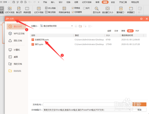 1.开启WPS软件,点击菜单栏“文件”并在下拉菜单找到“打开”,然后找到想要去掉虚线框的PPT文件:
