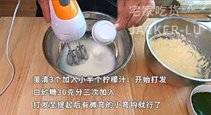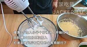 蛋清3个加入小半个柠檬汁,开始用电动打蛋器打发,白砂糖30克分三次加入。
