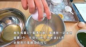 取鸡蛋3个把蛋黄和蛋清分离,蛋清放一边备用。蛋黄3个、牛奶95克、玉米油15克,混合均匀。