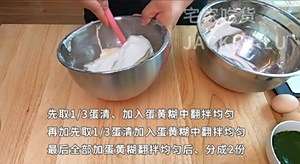 先取1/3打发好的蛋清,加入蛋黄煳中,翻拌均匀。再加入1/3打发好的蛋清,继续翻拌均匀。