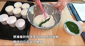 把准备好的抹茶浆加入原味面煳,翻拌均匀后装入模具。
