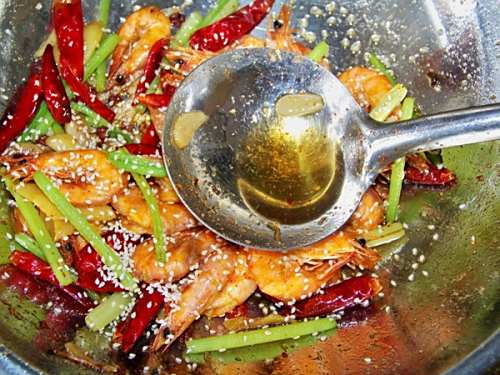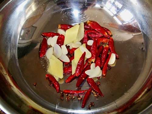 5锅内下5克油,六成热下干辣椒、连枝爆、姜蒜爆香