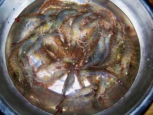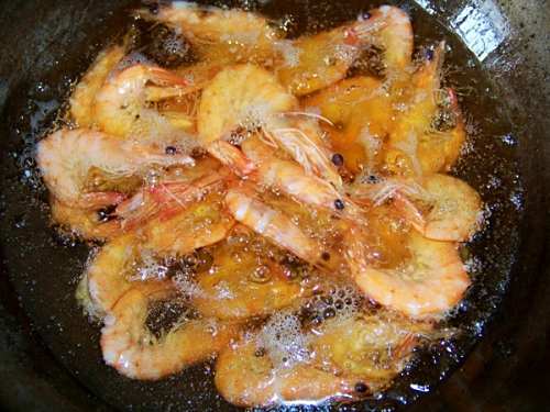4坐锅起大油,下明虾过油至头壳半透明,虾身蜷成U字形,捞出沥油待用