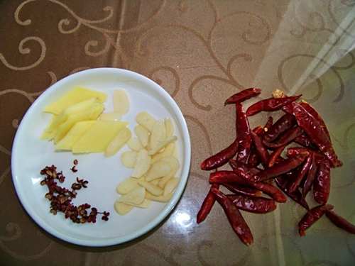 3姜蒜切片,连枝爆、干辣椒洗净,香芹洗净切段待用