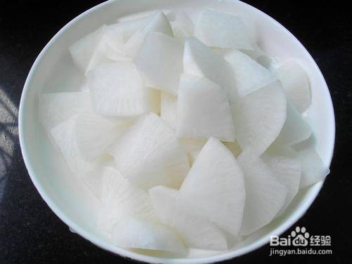 白萝卜洗净后削皮,切成大块备用。