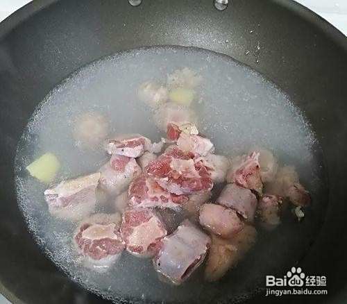牛尾骨剁成小块,洗净后放入锅中,加水、姜片和料酒焯水。