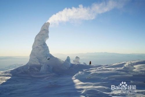北极雪烟囱。地下火山的热气喷出冰面之后很快冷却结冰进而形成了雪烟囱。