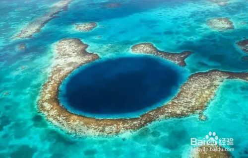 伯利兹蓝洞。洞穴形成于海水还没有淹没这个地区的时候。图中的深蓝色圆形区域是一个巨大的洞穴系统。