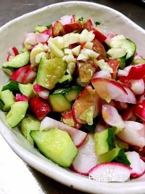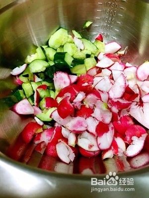 经过15分钟,黄瓜和萝卜会出一些水,控去不要。