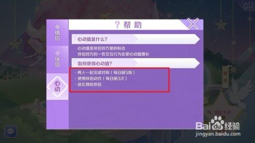 第三步进去帮助界面之后,可以看到心动值是双方伴侣爱的表现,可以通过一起完成游戏对局,使用伴侣动作,送礼物给伴侣进行提高心动值,如下图所示: