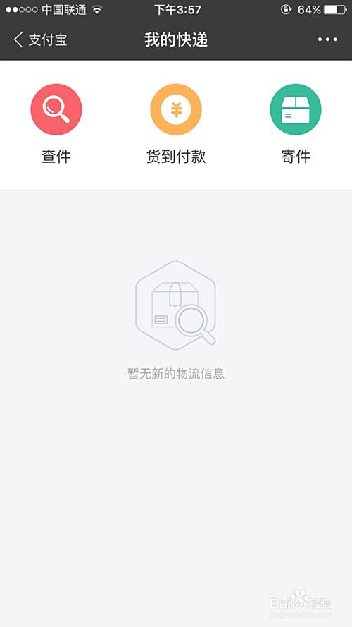 进入到我的快递页面之后,下方有三个服务功能,分别是:查件、货到付款以及寄件,如图所示。