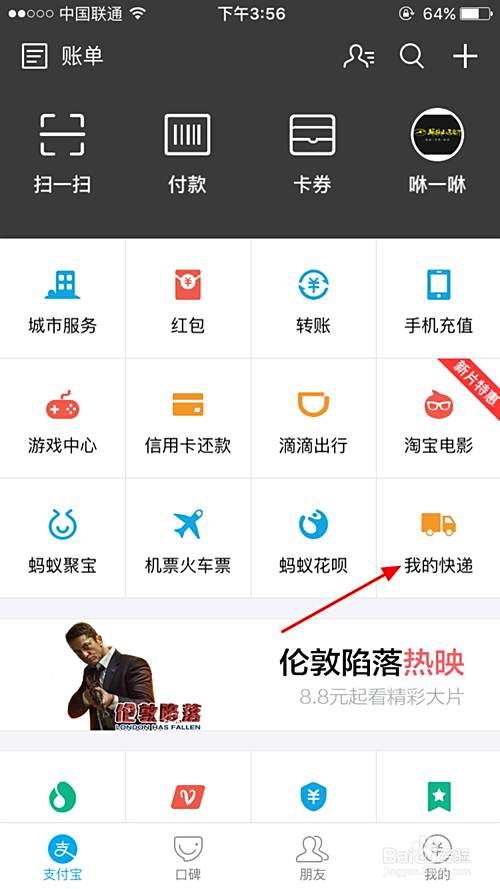 登陆成功之后进入到了支付宝首页,在其下方我们便可找到【我的快递】服务页面,如图所示。