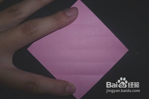 像第三步一样,把两角折回中心,沿图中虚线将角向中间折,与第二条折痕重合,四角都做同样的步骤。
