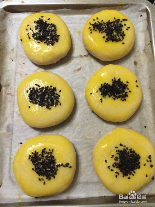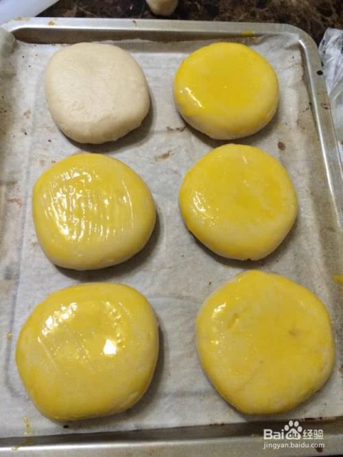 17把包好的面团收口朝下放在烤盘上,用手轻轻压扁一点,在面团表面刷一层蛋黄