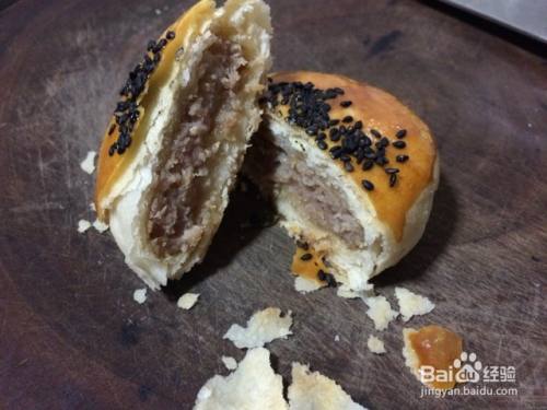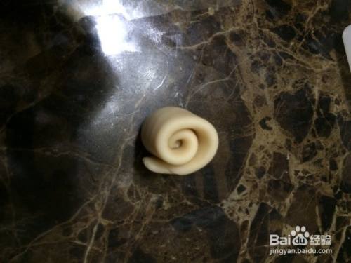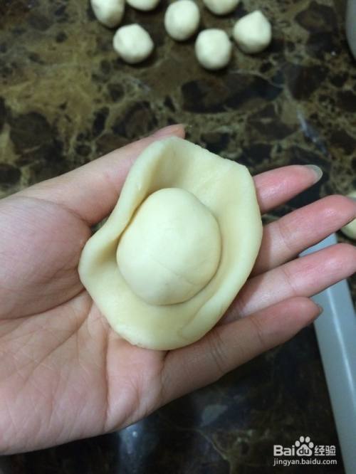 6取水油皮在手掌上压扁,把油酥放在水油皮上