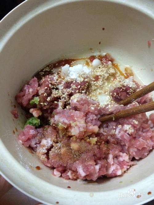 1制作鲜肉馅,把猪肉,砂糖,蜂蜜,炒熟的白色芝麻,香油,酱油,料酒,蒜末,姜末,盐,调味品放入大碗里。