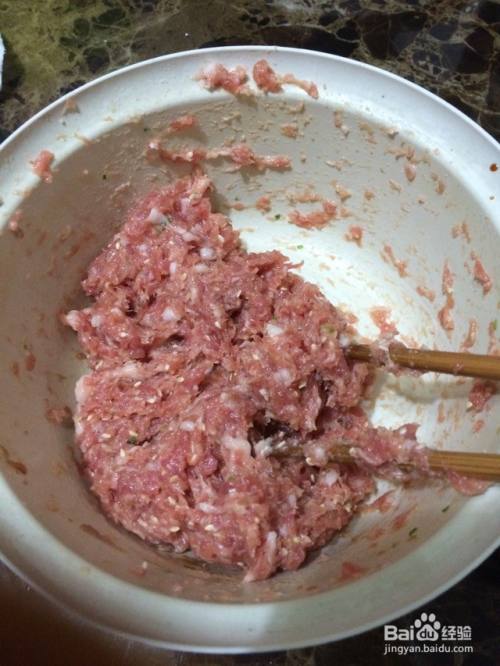 2用筷子不断搅拌肉馅直到出现黏性(俗称搅拌上劲)