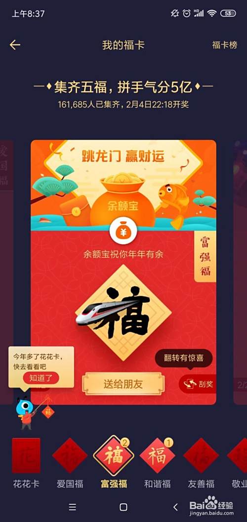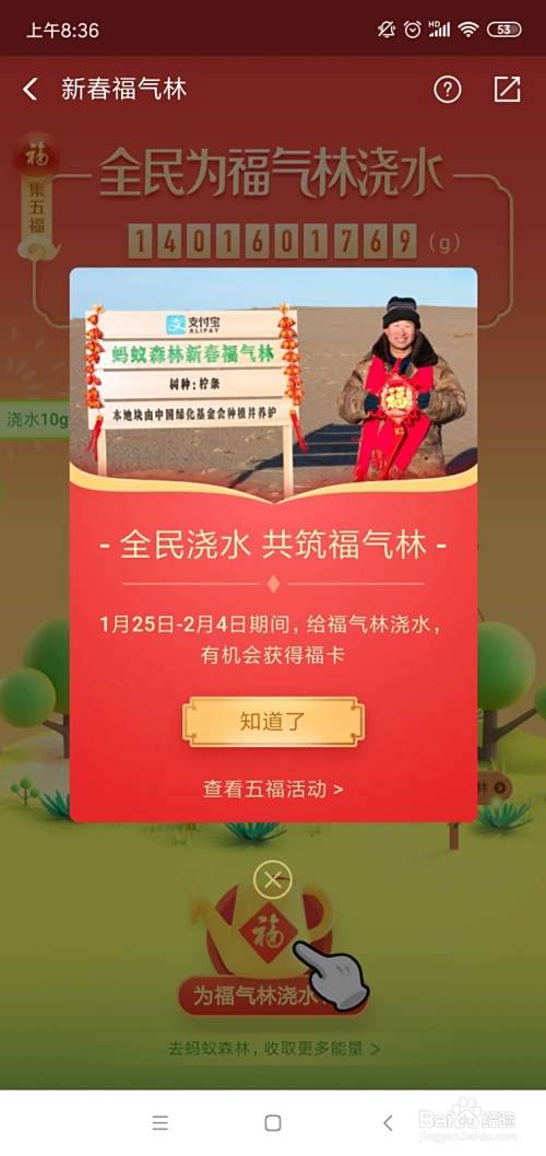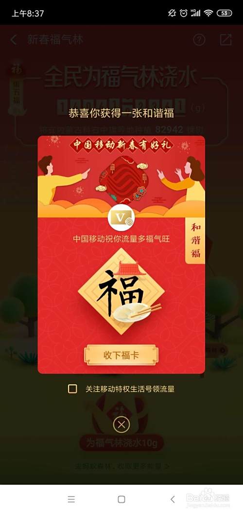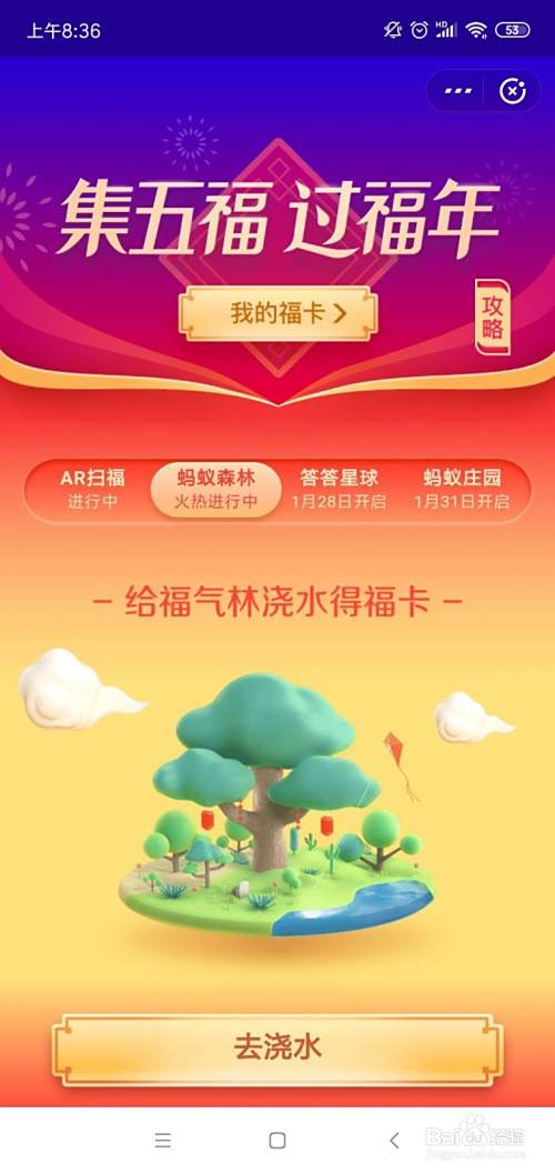 如下我们点击为福气浇水,浇完脾糟水就能获得“福”卡;