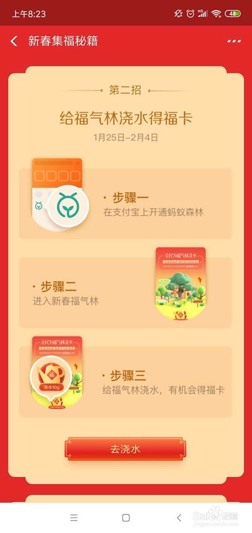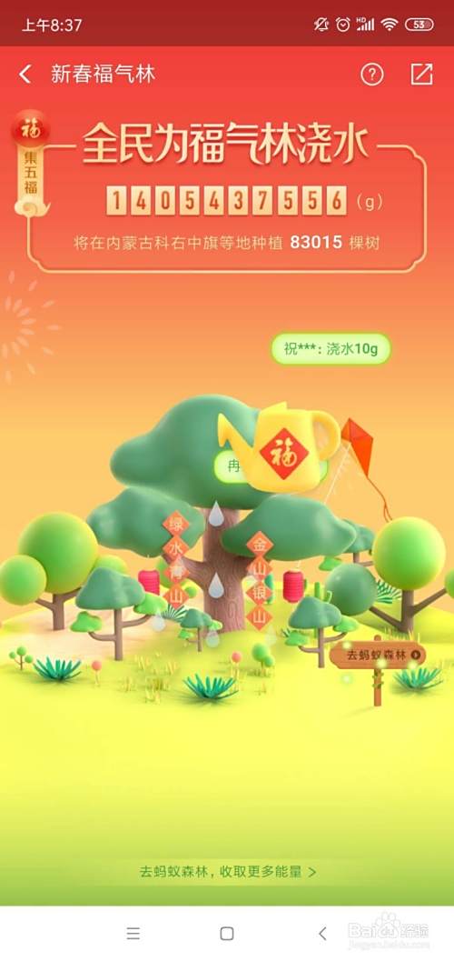 进入蚂蚁森林——进入新春福气林——给福气浇水——获得福卡;