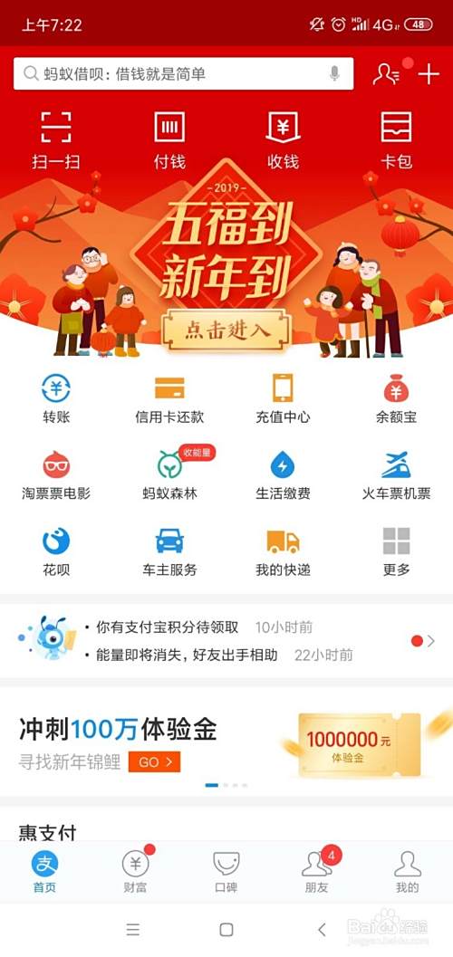 打开支汽获付宝,在首页栏就能看到扫五福的活动,我们点击进入;