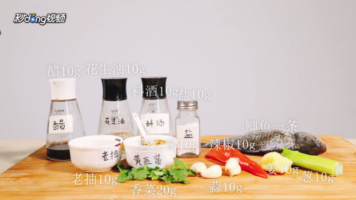 1准备鲫鱼一条,香菜20g,葱,姜,蒜,辣椒各10g,黄豆酱10g,花生油10g,盐,醋,料酒各10g。