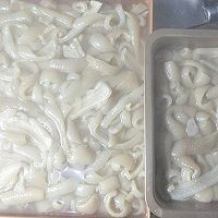 开大火煮开后把猪皮盛出切成条(把葱姜蒜和料包捞出丢掉即可),放入锅中继续中小火煮35~45分钟左右。