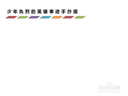首先,用彩笔在白纸上,画出含有立体感小长方形框架并涂上颜色,在白纸的顶部靠左写上字:【少年先烈的英雄事迹手抄报】的标题,如下图所示。