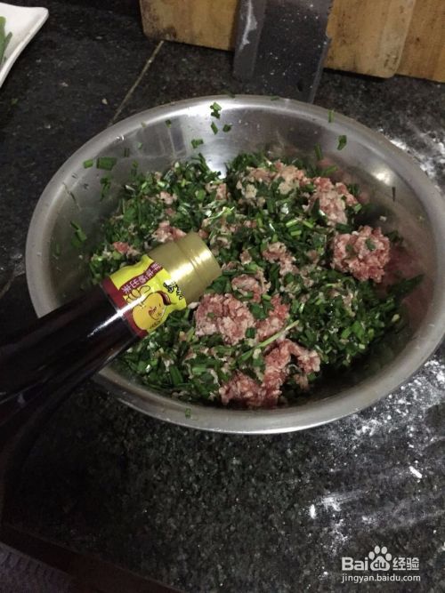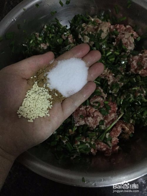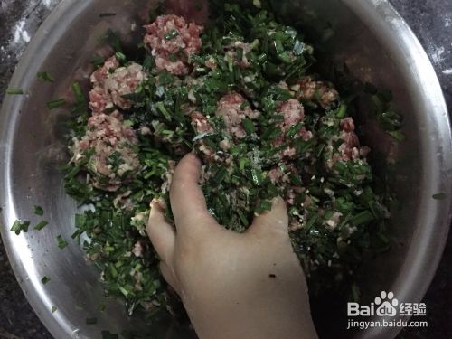 将切好的韭菜,姜末,肉馅,植物油,倒入盆子里,放入适量食用盐,十三香,香油,味极鲜,搅拌均匀,准备包蒸饺。