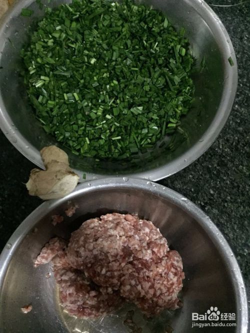 开始准备食材,猪肉馅500克,韭菜300克,姜1块。