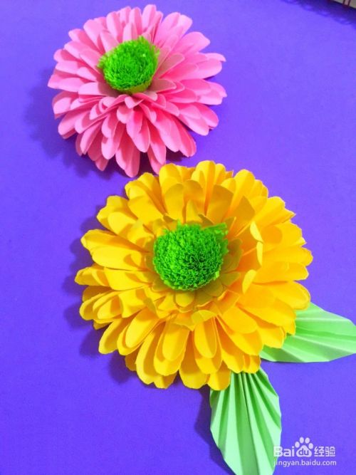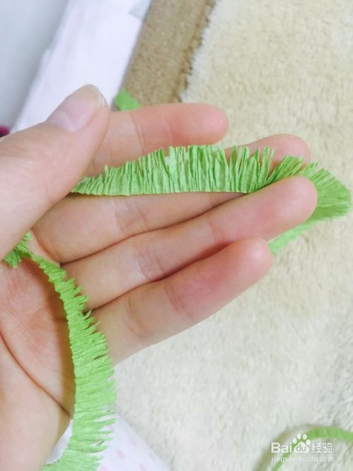接着做花蕊,绿色彩纸剪成细长条,在剪出均匀的小流苏,从一头卷起来