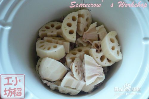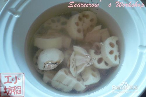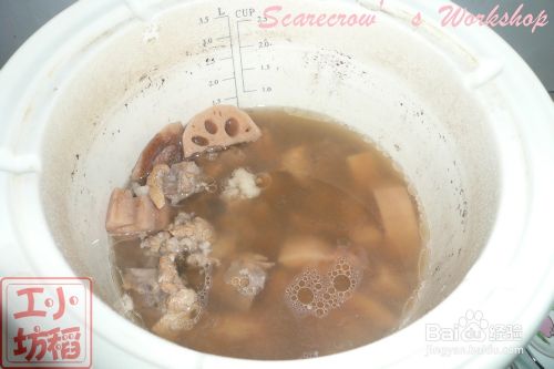 将处理好的猪龙骨和莲藕放入锅中,加适量清水,慢火炖上两至三小时即可。