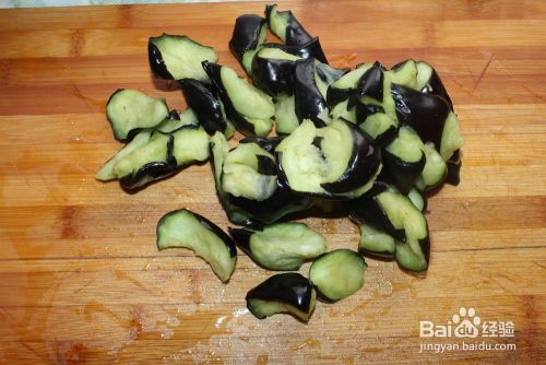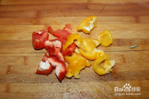 茄子、甜椒切块备用,大家记得肉要切片,用水淀粉腌一会儿。