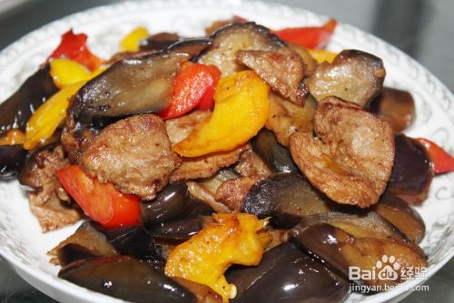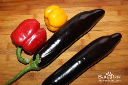 首先准备好茄子和甜椒,除此之外我们要准备适量猪肉。