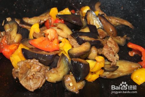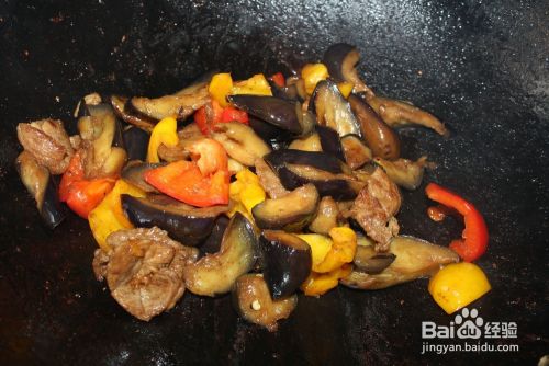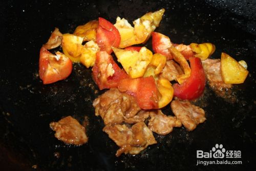 放入适量甜面酱调味,放入甜椒,因为之前说过茄子要蒸,所以我就先放甜椒,给大家按照蒸过之后的步骤做。