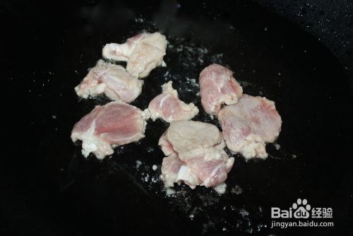 锅中放油(少放,平时炒茄子的四分之一),油热后放入猪肉略炒。